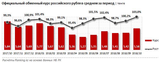 Официальный обменный курс российского рубля в среднем за октябрь составил 5,58 тенге за 1 рубль, что на 3% больше, чем в прошлом месяце, но на 4,5% меньше, чем за октябрь прошлого года.