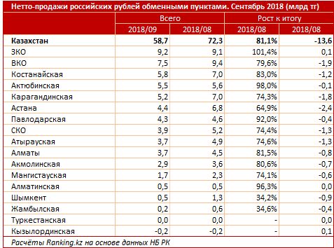 Среди регионов РК в сентябре отрицательные объёмы нетто-продаж российских рублей были зафиксированы только в двух областях — Кызылординской и Туркестанской. Казахстанцы там сдали в обменники больше рублей, чем выкупили.