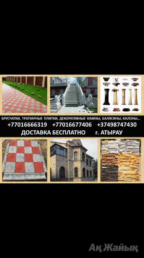 САМАЯ ВЫСОКОКАЧЕСТВЕННАЯ БРУСЧАТКА В АТЫРАУ!!! БРУСЧАТКИ БОЛЕ 18-И ВИДОВ И РАЗНЫХ ЦВЕТОВ, ТРОТУАРНЫЕ ПЛИТКИ (25X25 30X30 33X33 40X40 50X50), ДЕКОРАТИВНЫЕ КАМНИ(еще специальный разливной лак для декоративного камня - водостойкий, морозостойкий, глянцевый и матовый ), 3D ПАНЕЛИ, БАЛЯСИНЫ, ПЕРИЛЫ, ТУМБЫ,КОЛОННЫ, БОРДЮРЫ,ВОДОСТОКИ, ГАЗОБЛОКИ, ФОНТАНЫ, БЕТОННЫЕ СТРУКТУРЫ,ШЛЯПКИ ДЛЯ ЗАБОР И КОЛОН(42X42, 45X45, 50X50, 60X60), ВАЗЫ ДЛЯ ЦВЕТЫ И ДРУГИЕ БЕТОННЫЕ ИЗДЕЛИЯ. ВСЕ ИЗ БУРОВОГО ЦЕМЕНТА. А ТАКЖЕ МЫ ПРЕДЛАГАЕМ ВАМ ИСКУССТВЕННЫЕ ГАЗОНЫ.ДОСТАВКА, ДИЗАЙН И ЗАМЕР БЕСПЛАТНО!!! РАБОТАЕМ БЕЗ ВЫХОДНЫХ БЕЗ ОБЕДА!!! НАШ АДРЕС г.АТЫРАУ НОВОСТРОЙКЕ СЗАДИ ЕВРАЗИЯ АВТОМОЙКЕ Имеется опытные мастера по укладке брусчатки и декоративных камней. https://www.youtube.com/watch?v=3UoZwxBltOE https://plus.google.com/113746165400526217244/photosТелефоны (8701)6666319, (8778)6666681, (8702)4440042, (87122)396298