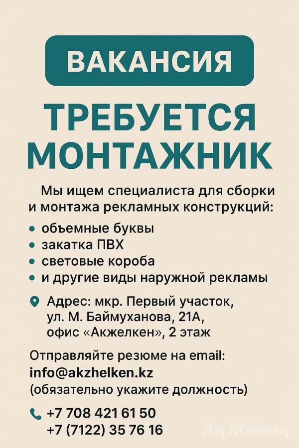 Резюме отправлять на эл.адрес: info@akzhelken.kz (с обязательным указанием должности) или приглашаем с резюме на собеседование по адресу: мкр. Первый участок, ул.М Баймуханова, 21 "А", офис "Акжелкен", 2 этаж