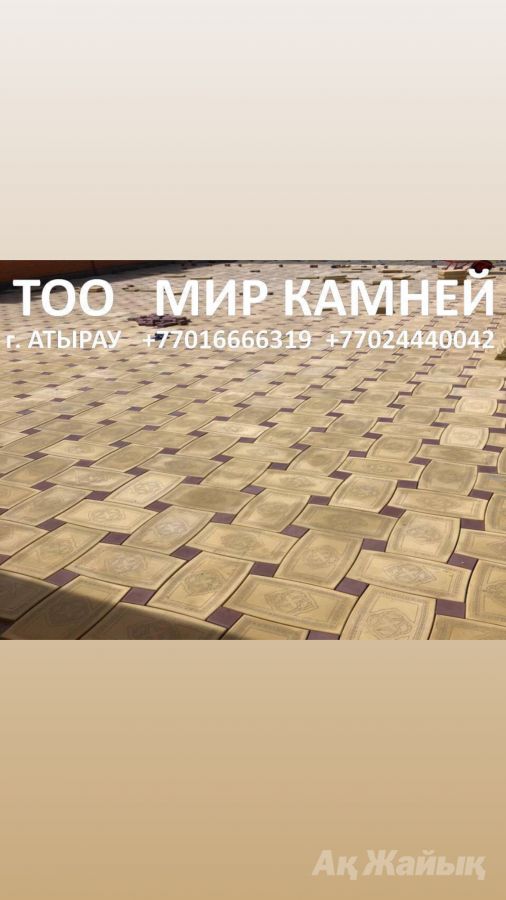 Описание: ТОО МИР КАМНЕЙ. Более 18-и лет мы производим и реализуем высокопрочный!!! Брусчатку, тротуарную плитку, декоративные камни, балясины, колонны, тумбы с шаром, перили армированный! из бетона М600 цемента, капители, 3D панели идеального качества в г.Атырау! Брусчатки цены От 2000 до 4800тг. БОЛЕЕ 33 ВИДОВ! И РАЗНЫХ ЦВЕТОВЫХ ГАММАХ! Так же производим: Бордюры дорожные и поребрик разных размером. водостоки, колпаки на столбы забора любой размер! КАЧЕСТВО ГАРАНТИРУЕМ!!! ДИЗАЙН, ЗАМЕР И ДОСТАВКА БЕСПЛАТНО!!! ТАК ЖЕ ИМЕЕТСЯ ВОЗМОЖНОСТЬ ОФОРМИТЬ В КРЕДИТ НА МЕСТЕ. Имеются опытные мастера по укладке брусчатки и декоративных камней только нашего производства. Мы находимся по адресу: Новостройка, сзади АВТОМОЙКИ ЕВРАЗИЯ, По Яндексе или 2ГИС пишите МИР КАМНЕЙ адрес покажет к нам легко добраться! Работаем с 9.00 до 21.00 без выходных. Тел: 87016666319, 87786666681, 87024440042, +77122 39-62-98