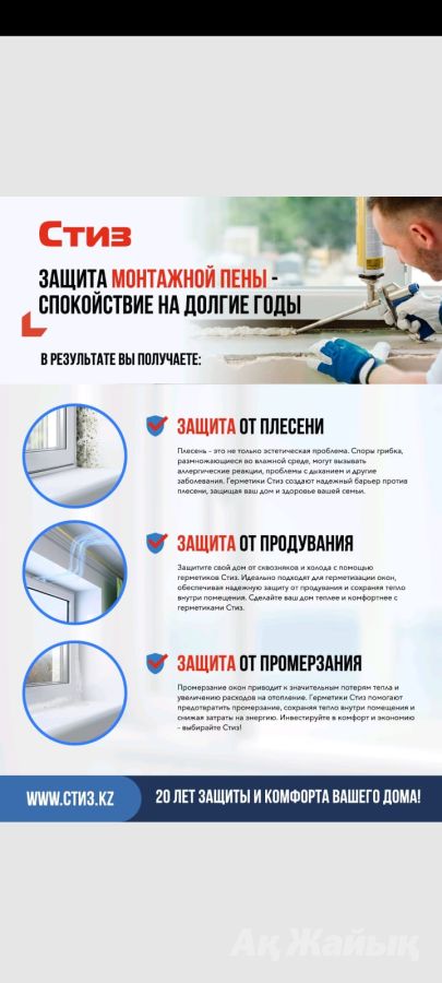 СТИЗ А- отличное техническое решение в защите монтажной пены от воздействия солнца, ливня, мороза и ветра. От солнца пена выгорает, дождевая вода проникает в пену, затем от мороза водяной пар замерзает, расширяется и разрывает пену, затем ветер выдувает остатки пены. Несколько лет, несколько циклов и пена превращается в труху, сыпется и теряет все свои полезные свойства. Команда @mirokon_atyrau.kz предлагает в Атырау защиту монтажной пены герметиком СТИЗ А, мы первые в Атырау, кто использует данную технологию на практике.