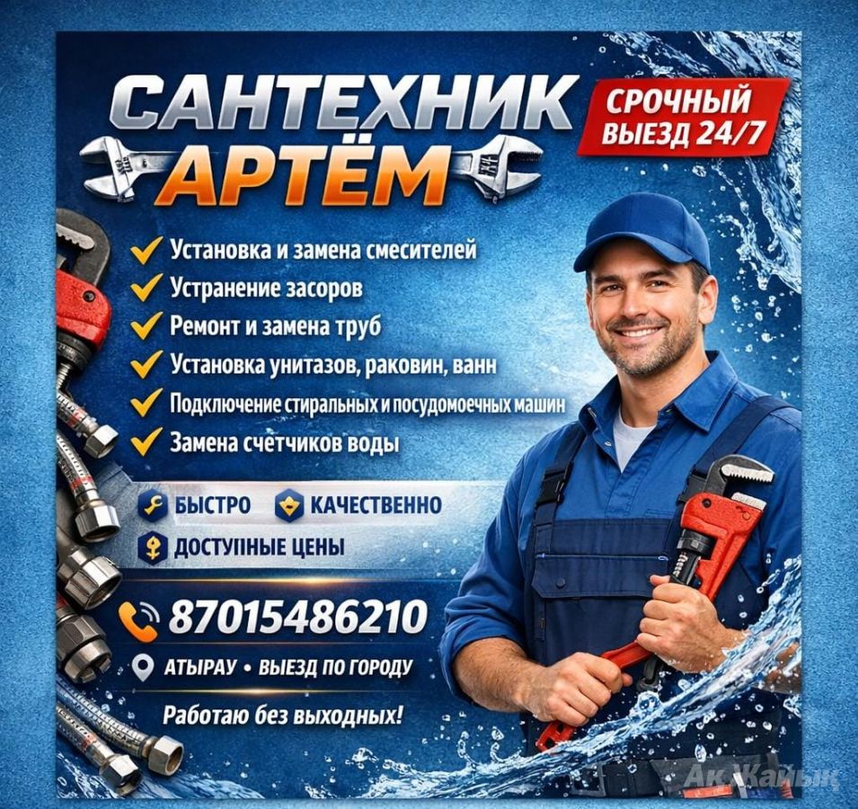 САНТЕХНИК АРТЁМ 🛠 ✔ Установка и замена смесителей ✔ Устранение засоров любой сложности ✔ Ремонт и замена труб ✔ Установка унитазов, раковин, ванн ✔ Подключение стиральных и посудомоечных машин ✔ Замена счётчиков воды 🔧 Быстро 🔧 Качественно 🔧 Доступные цены 📞 87015486210 📍 Выезд по городу Атырау