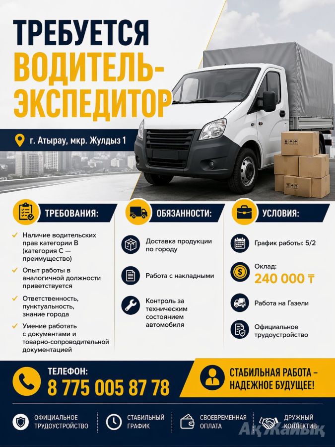 Требуется водитель-экспедитор Требования: - Наличие водительских прав категории B (категория C — преимущество) - Опыт работы в аналогичной должности приветствуется - Ответственность, пунктуальность, знание города - Умение работать с документами и товарно-сопроводительной документацией Обязанности: - Доставка продукции по городу - Работа с накладными - Контроль за техническим состоянием автомобиля Условия: - График работы: 5/2 - Оклад: 240 000 тенге - Работа на Газели - Официальное трудоустройство - Место работы: г. Атырау, мкр.Жулдыз 1 Контакты: Тел.: 8 775 0058778