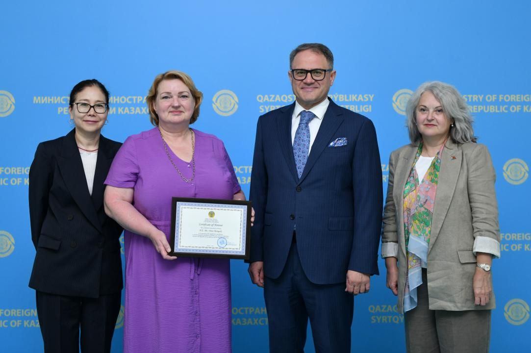 The Deputy Minister presented Irina Mangule with a Certificate of Honour on behalf of Deputy Prime Minister – Minister of Foreign Affairs of Kazakhstan Murat Nurtleu, emphasizing her valuable contribution to strengthening bilateral relations and fostering mutual understanding between the peoples of Kazakhstan and Latvia.