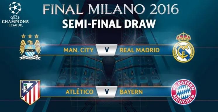 Жеребе қорытындысы бойынша ағылшындық «Манчестер Сити» мадридтік «Реалмен», ал мадридтік екінші клуб«Атлетико» мюнхендік «Баварияға» қарсы ойнайды. Бірінші ойындар 26-27 сәуірге, қарымта ойындар 3-4 мамырға жоспарланған.