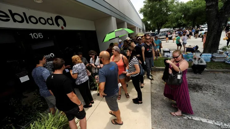 Орландодағы клубқа шабуылдан жараланғандарғам қан тапсыруға кезекте тұрған адамдар. АҚШ, 12 маусым 2016 жыл. Фото: ReutersФлорида штатының Орландо қаласында түнгі гей-клубта болған атыстан қаза тапқандар саны 50 адамға жетті. Pulse клубына келушілерге жаппай оқ атқан адамды полиция атып өлтірген. АҚШ тарихында мұндай кісі көп өлтірілген қанды қырғын бірінші рет болып отыр. Орландо мэрі Бадди Дайердің айтуынша, атыстан тағы 53 адам жараланған,- деп хабарлады Азаттық.