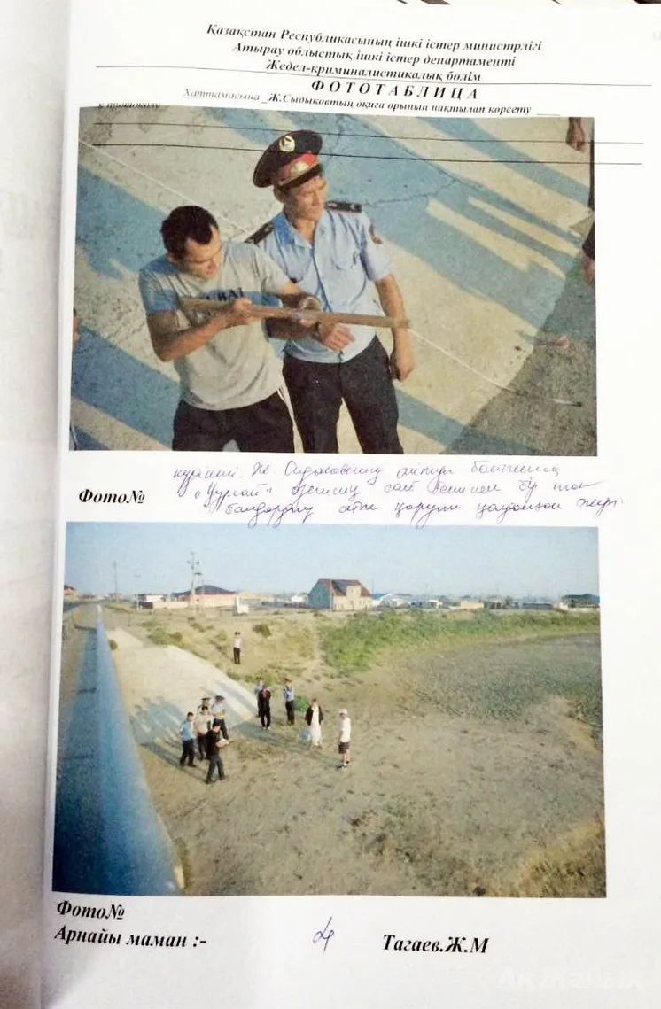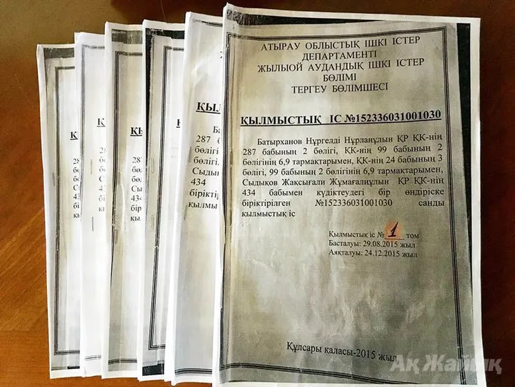 Жолболовтың айтуынша, қорғау құзырында бұрын Жылыой аудандық сотына айыпталушыларды қамауға алуға санкция беру үшін жіберілген, әр парағында оның түпнұсқа екенін растайтын Асылбековтің өз қолы мен Жылыой АІІБ мөрі басылған «бастапқы» қылмыстық істің көшірмесі бар екен. Онда оқ атқан өзі екендігі туралы Сыдықовтың мойындау жауабы бар.