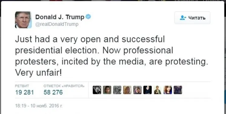 Трамп твиттердегі парақшасына былай деп жазды: «Сайлау барынша ашық түрде және сәтті өтті. Енді БАҚ қолтығына су бүріккен әккі шерушілер маған қарсы көтеріліп жатыр. Не деген әділетсіздік!»