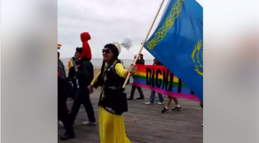 Нью-Йоркте бейдәстүрлі секс-азшылықтың шеруіне қатысушыларының бірі қазақтың ұлттық киімін киіп, Қазақстан туын көтеріп жүрді.