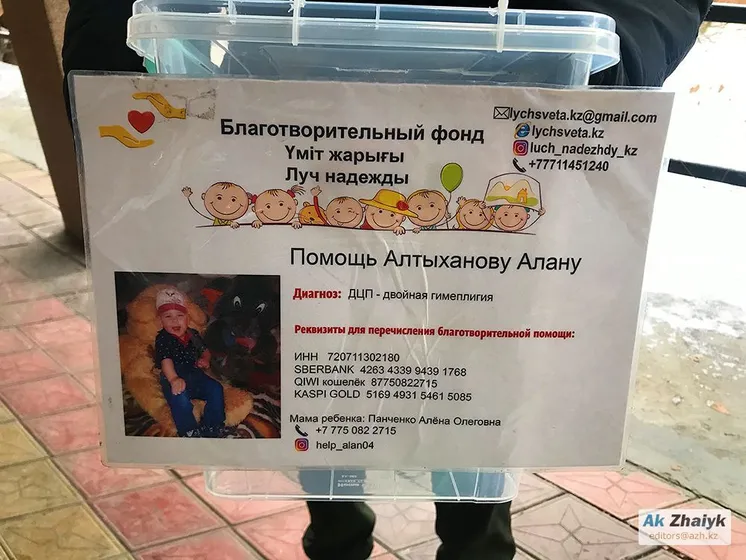 Мен қораптағы нөмірге қоңырау шалдым. Тұтқаны әйел адам көтеріп, өзінің Алан Алтыханов деген науқас баланың анасы екенін растады. Оның «Үміт жарығы» қорының Атырау филиалымен келісімшарты бар екен, оның жарамдылық мерзімі биылғы жылдың 31 желтоқсанына дейін.