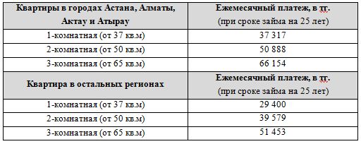 "Нұрлы жер" бағдарламасы бойынша пәтердің ауданы 80 шаршы метрден аспауы қажет. Ауданның ауытқуы 5 пайыздан аспауы керек. Осыған орай, 1-2-3 бөлмелі пәтерлер салынады. Мекеме өкілдері "7-20-25" бағдарламасы бойынша әкімдік арқылы алынған пәтерлердің ай сайынғы болжамды төлемін жариялады.