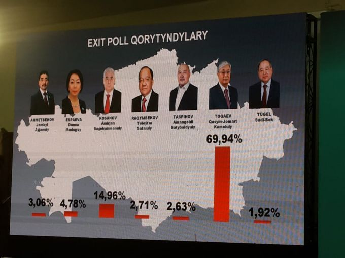 - Азаматтардан сұрау алу барысында кімге дауыс бергендіктері жайлы сұрақ қойылды. Сұрау нәтижесі: Жамбыл Ахметбеков 3,116 % дауыс жинады, Дания Еспаева 4,78 %, Әміржан Қосанов 14,96 %, Төлеутай Рахымбеков 2,71 %, Амангелді Таспихов 2,63 %, Қасым-Жомарт Тоқаев 69,94 % және Сәдібек Түгел 1,92 % дауыс алды, - деді Қалиев.