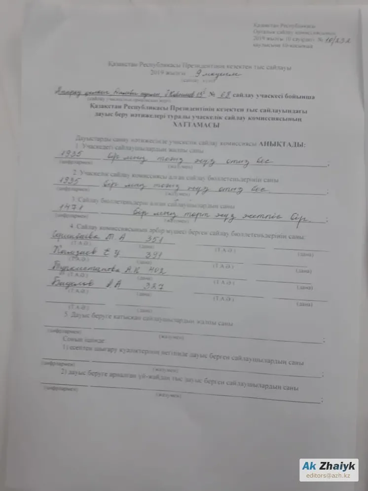 9 маусымда «АЖ»-дың редакциялық тапсырмасымен Атырау қаласының Дамбы ауылдық округындегі №68 сайлау учаскесіне бардым. Жергілікті сайлау комиссиясының мәліметінше, мұнда 1935 адамның сайлау құқы бар. Сайлаудың қорытынды хаттамасына сәйкес, ҚР Президентін сайлау учаскесіне 1471 адам келді және олардың 914-і Қосановқа дауыс берді.