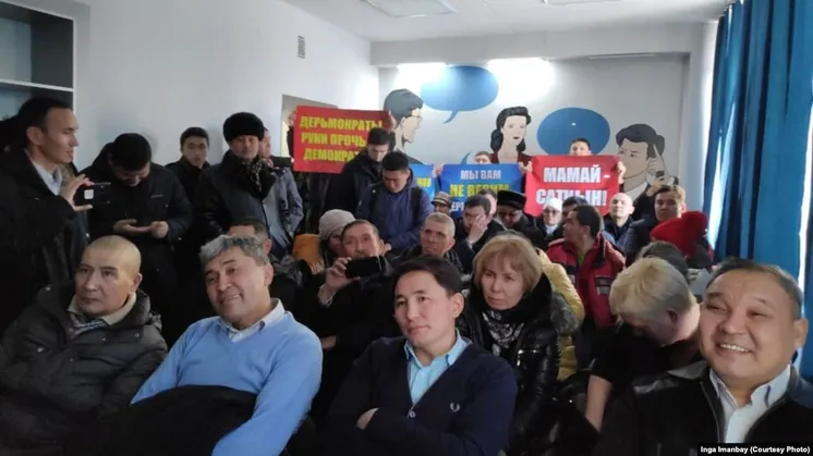 Бастамашыл топ өкілі Инга Иманбайдың Facebook желісінде таратқан тікелей эфирінен жиынға келген бірнеше адам залда “Мамай сатқын!” және “Біз сенбейміз” деген жазуы бар плакат ұстап тұрғаны байқалады.