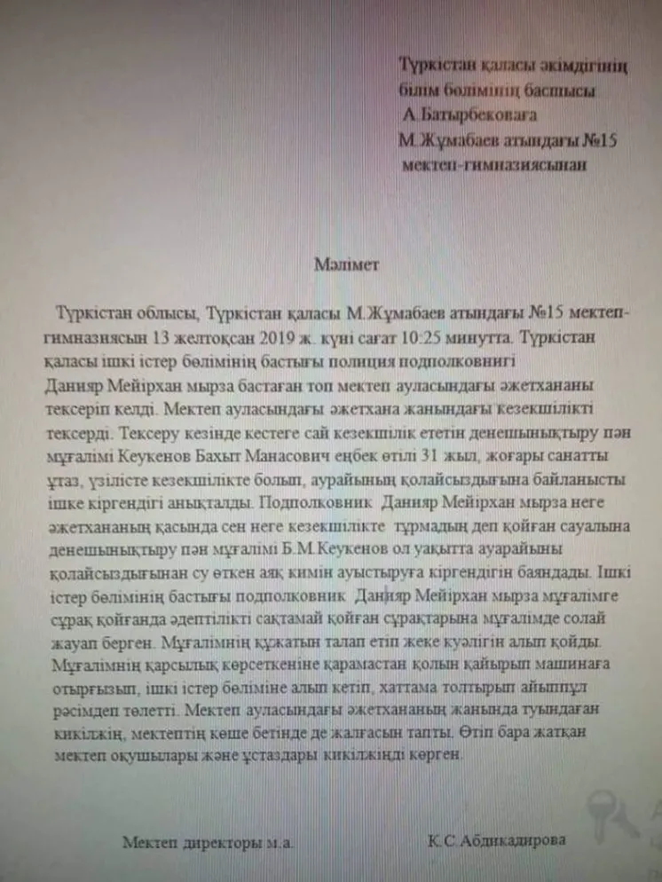«Түркістан қаласындағы №15 мектептің мұғаліміне қатысты орын алған оқиғаға ұқсас жағдайларға мүлдем жол берілмеуі тиіс.