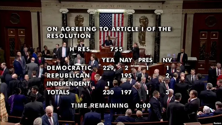Осылайша Дональд Трамп АҚШ тарихында конгрестің өкілдер палатасы импичмент жариялаған үшінші президент атанды. Өкілдер палатасы оған екі айып бойынша импичмент жариялауды қолдады: қызметтік өкілетін асыра пайдалану және конгресс зерттеуіне кедергі келтіру. Алғашқы айып бойынша, Трамп президент өкілетін пайдаланып, шетел әріптесінің көмегімен (нақты жағдайда Украина) 2020 жылы болатын президент сайлауындағы саяси қарсыласына қарсы істі зерттеуге тырысқан. Екінші айып бойынша, Трамп импичмент жариялау мүмкіндігі бойынша конгресс зерттеуі кезінде сұрау салынған мыңдаған құжатты бермеген және осы зерттеу аясында конгресс талқылауына бармақ болған куәгерлерге кедергі келтірген.