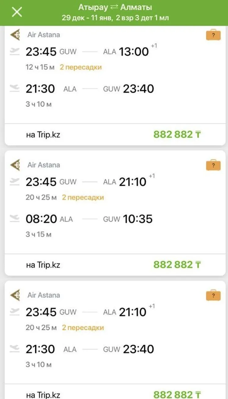 Сондай-ақ, әлеуметтік желілерде де Aviata.kz қосымша бетшелерінде Air Astana әуе компаниясының «Алматы-Атырау» рейсінің билетіне аспандағы бағаны сұраған скриншот тарап жатыр. Алматыдан Атырауға дейін бір әуе билеті ұлттық әуе тасымалдаушының ұшағында 300 мыңнан 882 мыңға дейін тұрады.