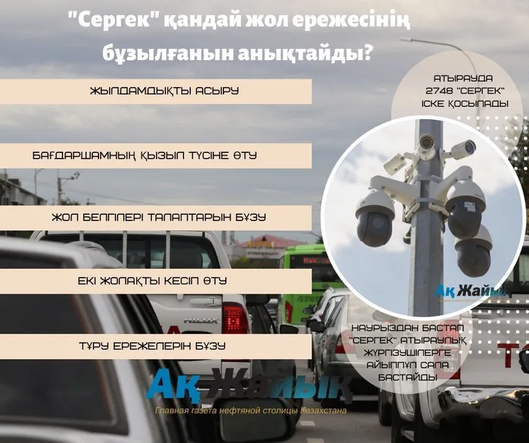 - Сақтандыру құжатының жоқ екендігін тек аттестациядан өткен полиция инспекторы анықтай алады. Дерекқорлар базасының біріктірілуінің арқасында бұл ақпарат полицейлерге мобильді планшеттер арқылы қолжетімді. «Сергек» өз кезегінде автоматты түрде жол қозғалысы ережелерінің (ЖҚЕ) мынадай бұзушылықтарын анықтайды: жылдамдық режимін арттыру, бағдаршамның қызыл түсінен өтіп кету, жол белгілері мен таңбаларының талаптарын бұзу, транспорт құралдарының тоқтау немесе тұрақ ережелерін бұзу. Бұзушылықтарды автоматтық режимде тіркеуден басқа, «Сергек» камераларынан деректерді үнемі оператор қарап отырады ол басқа да бұзушылықтарды қолмен тіркей алады. Мәселен, қауіпсіздік белдігінің тағылмауы немесе рөлде телефонмен сөйлесу.