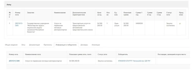 Еңбек және халықты әлеуметтік қорғау министрлігі мемлекеттік сатып алулар сайтында «жеңіл автокөлікпен тасымалдау» қызметін алу үшін тиісті лотты 2019 жылдың 31 қаңтарында жариялаған. Арада он күн өте «бір көзден сатып алу» тетігі арқылы «Президент Іс басқармасының Автошаруашылығы" кәсіпорынмен «өкілдік сыныбының автомобилін ұсыну бойынша көлік қызметтері» туралы келісімшарт жасалған.