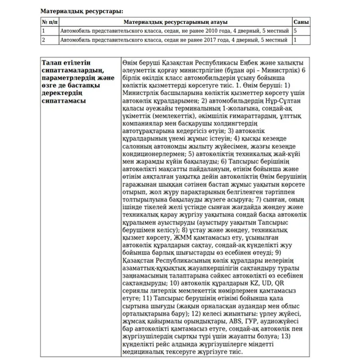 Осылайша, Еңбек министрлігі шығарылған уақыты 2010 жылдан төмен емес, 4 есікті, 5 орынды «өкілдік сыныбына» жататын бес автокөлік және шығарылған уақыты 2017 жылдан төмен емес, 4 есікті, 5 орындықты «өкілдік сыныбына» жататын , бір көлікті жалға алып отыр. Жалға алу мерзімі 2020 жылдың 31 желтоқсанында аяқталады. Алты көлікті жалға алу құны, айтқанымыздай, бір жылға 54 млн теңге.