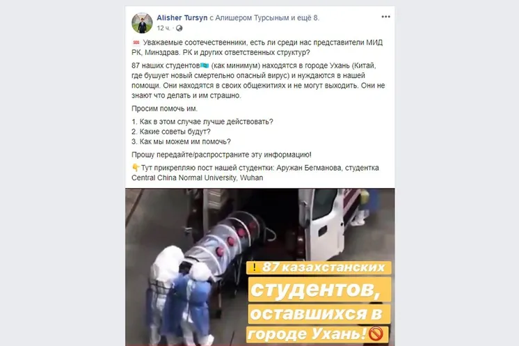 «Мен «Болашақ» бағдарламасы бойынша Швейцарияда оқып жүрмін. Бірақ қытайдағы жерлестеріміз күнде хабарласып жатыр. Мендегі ақпарат бойынша Қытайда 14 мыңнан астам студентіміз бар. Сыртқы істер министрлігі бұл мәселе бойынша бүгін брифинг өткіземіз депті. Соны қыз-жігіттер тағатсыздана күтіп отыр. Медициналық бетпердені ұшақпен жеткізіп бере ме, әлде бұл жақтан алып кете ме соны білгілері келеді. Қатты қорқып отыр», - дейді “ҚазАльянс” қоғамдық бірлестігі (шетелдегі қазақстандықтар альянсы) басшысының міндетін атқарушы Әлішер Тұрсын.