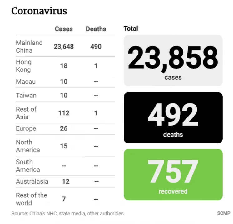5 ақпандағы таңғы жағдай бойынша коронавирустың жаңа түрінен қайтыс болғандардың саны 492-ге жетіп, ал 24 324 адам дерт жұқтырған, - деп хабарлайды Tengrinews.kz тілшісі. Тағы 892 науқастың ауруханадан шығарылғаны айтылады. Бұл туралы South China Morning Post газеті Қытайдың денсаулық сақтау комитетіне сілтеме жасай отырып хабарлады.