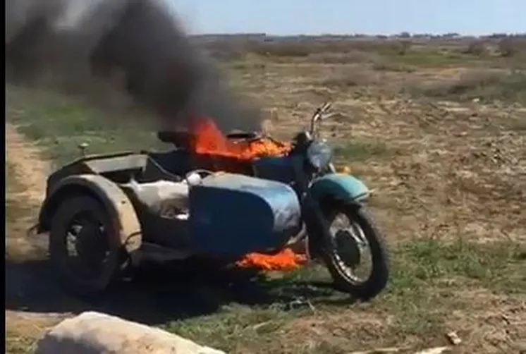 Бұл жерде арбасы бар көне «Урал», қасында «астау» және қапшықпан шашылған бірнеше табан көрініп тұр. Соның арасынша, неге екені белгісіз, браконьерлердің бірі байқатпай келіп, мотоциклге өрт қойды... Ақыры, балық инспекторлары құқықбұзушыларды ұстады ма, жоқ па белгісіз.