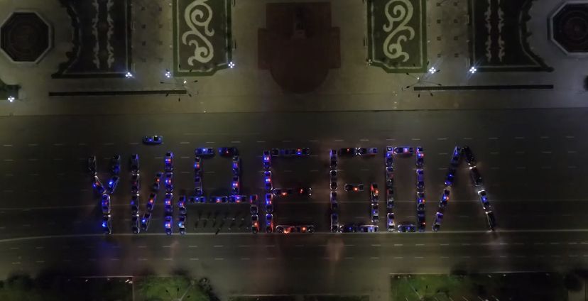 Тәртіп сақшылары 80 патрульдік көлікпен орталық көшеде "Үйде бол" деген жазу құрастырып, бейнеролик түсірген.