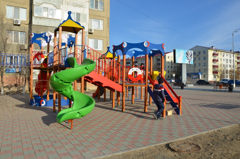 Бұл учаскеге тас төселіп, ойын сырғанақтары мен әткеншектер орнатылды. Бәрі жақсы-ау, тек бұл ойын алаңы ешқандай нормативтер мен ережелерге сай келмейді.