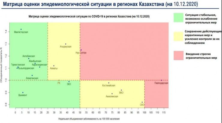 Денсаулық сақтау министрлігінің мәліметінше, 10 желтоқсандағы жағдай бойынша "қызыл" аймақта Нұр-Сұлтан мен Павлодар облысы орналасқан.