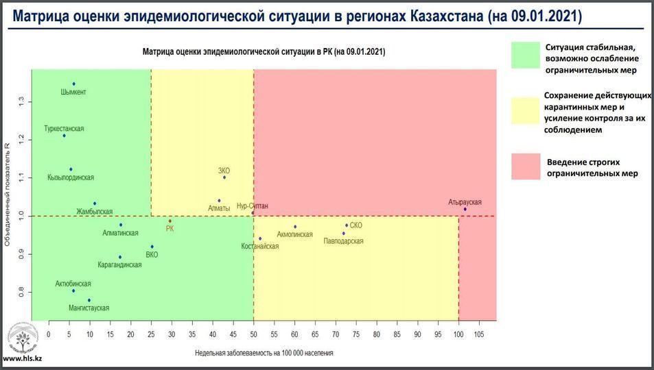 2021 жылғы 9 қаңтардағы Қазақстан аймақтарындағы эпидемиологиялық жағдайды бағалау матрицасы.