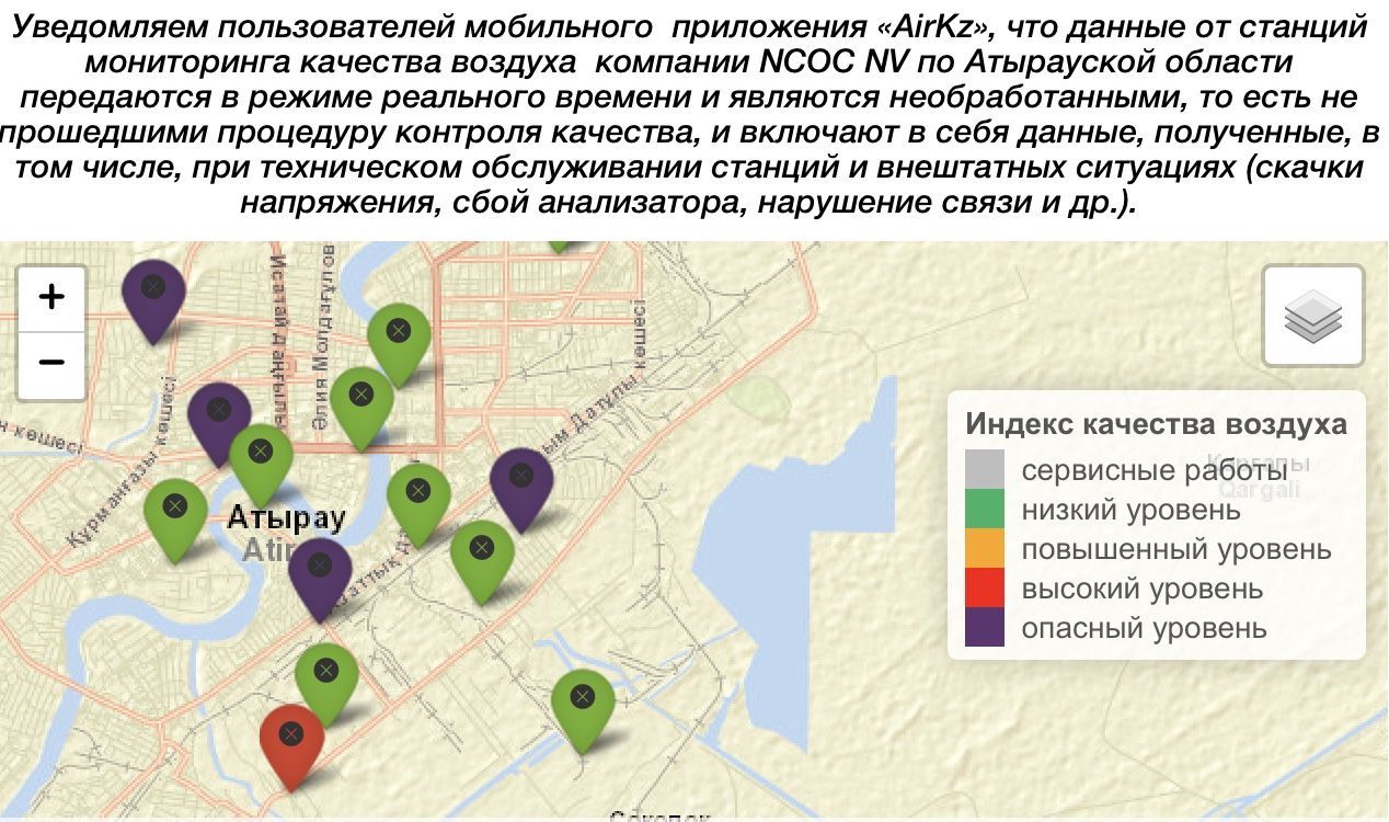 Өзімізге «Қазгидрометтің» интерактивті картасының мәліметтерін бақылауға тура келді. Төрт нүкте күлгін түске боялған, бұл ауаның қауіпті ластану деңгейін білдіреді, ал біреуі -қызыл түсті, бұл ластанудың жоғары деңгейін көрсетеді.