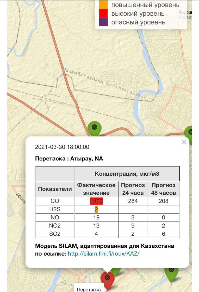 Сонымен, 30 наурызда кешкі сағат 18-де ПНЗ №8 (Химпоселок) ауданында РМ бөлшектерінің көбейгені тіркелді, ал Перетаска аймағында көміртегі тотығының (СО) мөлшері 4466 еседен асты (!). - Википедияға сүйенсек, бұл көміртегі тотығы.