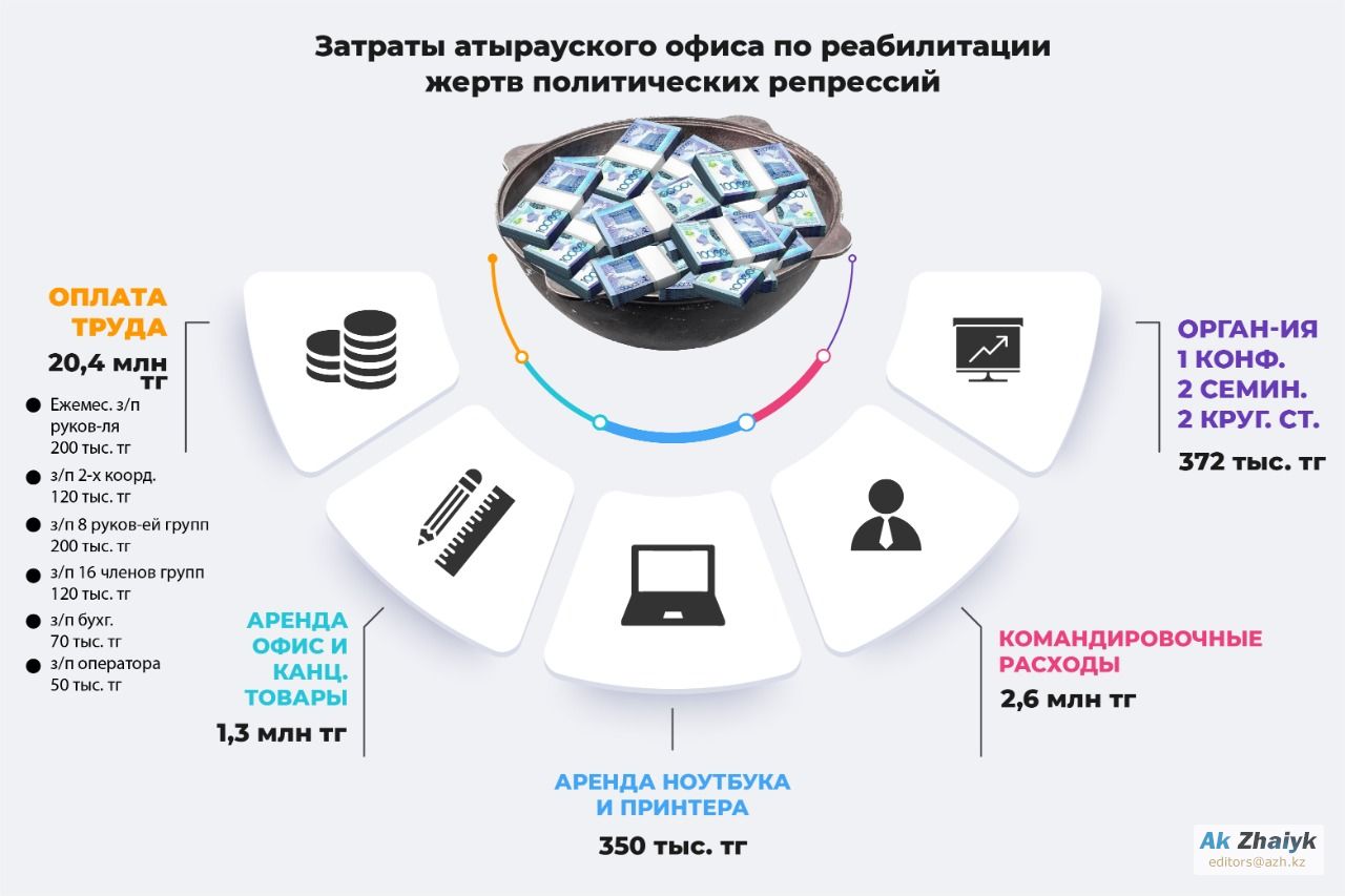 Атырау облысының ішкі саясат басқармасы мемлекеттік сатып алу сайтында бюджеті 25 миллион теңге болатын саяси қуғын-сүргін құрбандарын ақтау жөніндегі кеңсені ашуға тендер шарттарын жариялады. Оның 20 миллионы құрамында 4-5 адамнан тұратын сегіз жұмыс тобының қызметкерлеріне төленетін жалақыға жұмсалады. Олардың құрамына тарихшылар, оқытушылар, діни ұйымдардың қызметкерлері, студент-еріктілер кіреді. Кеңсе тек осы жылдың соңына дейін жұмыс істейтін болады.