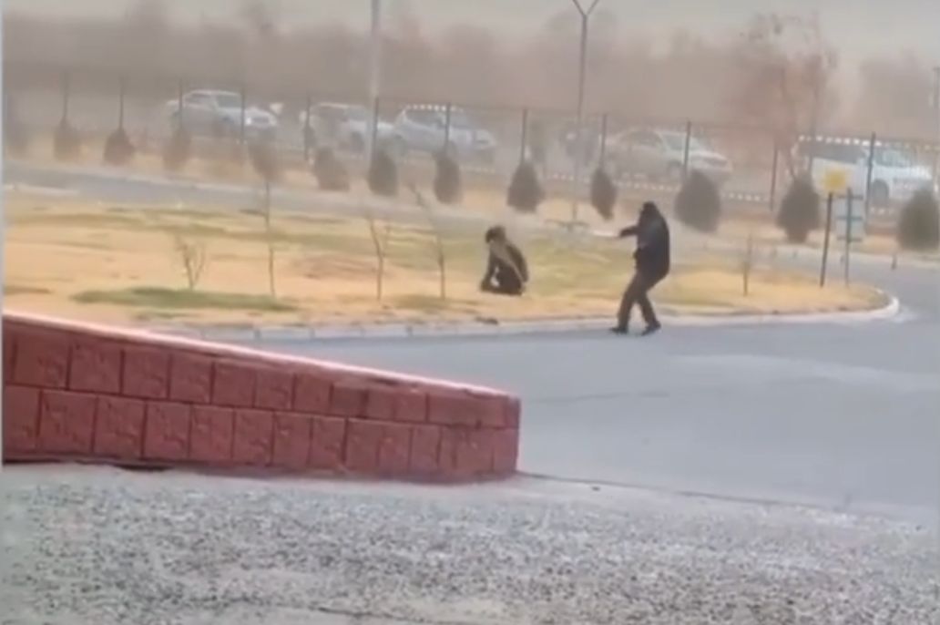 Желіде жарияланған видеолардың біріне ер адам мен әйел түсірілген. Олардың бірі қатты желден аяғына тұра алмай, құлап, бірнеше метрге ұшып кетеді. Әйелдің қасындағы ер адам көмектесуге тырысады, бірақ ол да желге қарсы тұра алмайды.