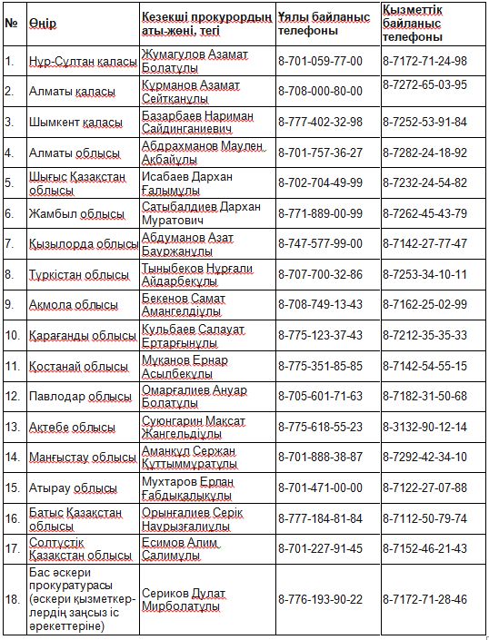 Бас прокуратурамен өңірлердегі кезекші прокурорлардың тізімі жарияланады. Оларға құқық қорғау және арнайы органдар қызметкерлерінің ұстап алу, жеткізу, қылмыстарды тергеу барысындағы заңсыз әрекеттеріне шағымдана аласыз.