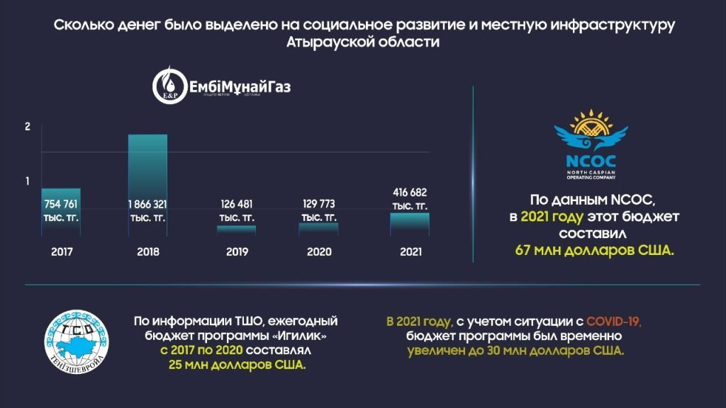 Сонымен қатар, «АЖ» 2019, 2020 және 2021 жылдары өңірімізде жүзеге асырылған ТШО-ның әлеуметтік жобаларын олардың құнын көрсете отырып, атап шығуды сұрады. Олар бізге жауап ретінде тек жалпы мәліметтерді жолдады: «Игілік» бағдарламасының 2017-2020 жылдар аралығындағы жылдық бюджеті 25 миллион долларды құрады. 2021 жылы COVID-19-ға қатысты ахуал бойынша бағдарлама бюджеті уақытша 30 миллион долларға дейін көбейтілді. Бұдан басқа, Артығалиев ТШО әлеуметтік жобаларды инвестициялау бойынша барлық лицензиялық және келісімшарттық міндеттемелерін орындағанын атап өтті.