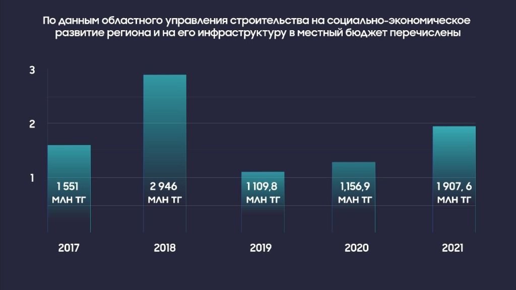 Мәселен, 2017 жылы төлемдер 754 миллион 761 мың теңге, 2018 жылы 1 миллиард 866 миллион 321 мың, 2019 жылы 126 миллион 481 мың, 2020 жылы 129 миллион 773 мың, 2021 жылы 416 миллион теңгені құраған.