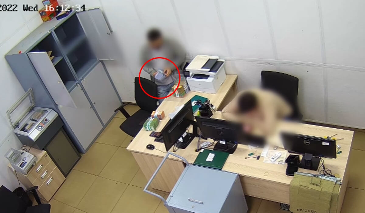 Банктің 2021-2023 жылдар аралығындағы бейнебақылау камераларының жазбалары тәркіленді, онда кассадан халаттың жеңіне оралған ақшаларды шығару арқылы ұрлау фактілері тіркелген.
