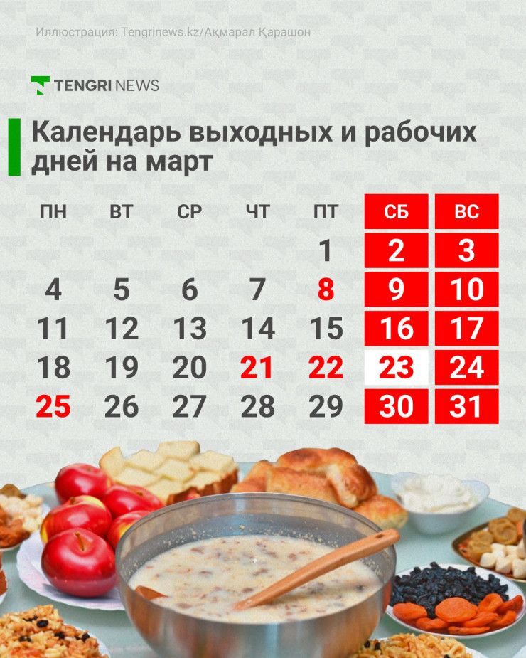 - Жалпы аптада бес күн жұмыс істейтіндер үшін осы ай ішінде 14 демалыс және 17 жұмыс күні болады.