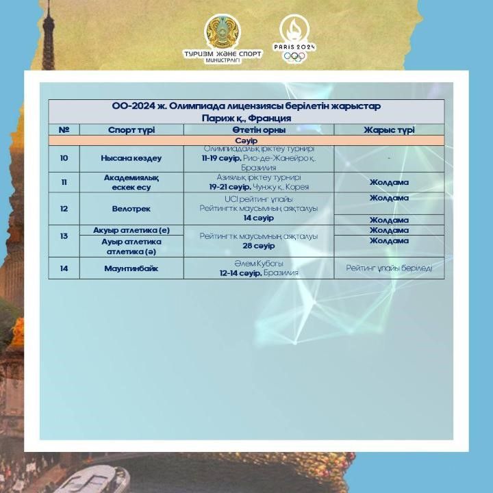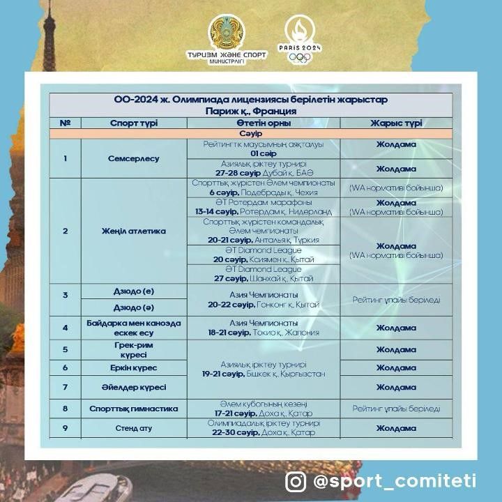Министрлік сәуір айында Олимпиада лицензиясы берілетін жарыстар кестесін жариялады.