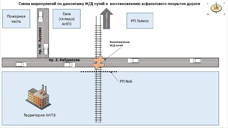 21 маусым күнгі сағ. 20:00-ден 23 маусым сағ. 20:00-ге дейін З.Қабдолов даңғылынан зауыт бағытындағы автомобиль жолын кесіп өтетін №1 кіреберіс темір жолы маңында демонтаждау және асфальт жолдарын қалпына келтіру жұмыстары жүргізіледі.