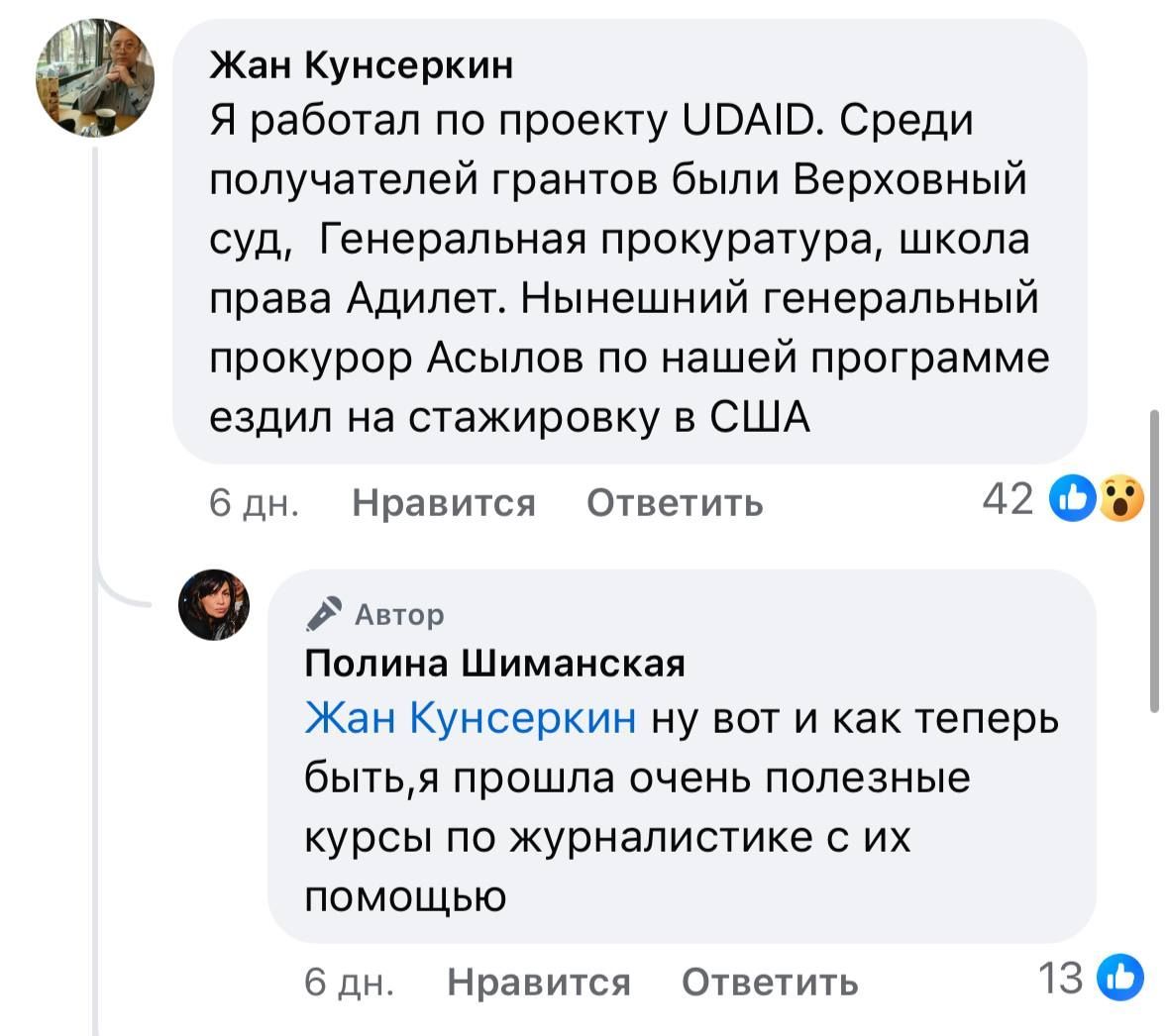 Telegram арнасының хабарлауынша, бұған дейін бұл скриншот әлеуметтік желілерде таралып, онда танымал қазақстандық заңгер Жан Кунсеркин USAID грантын алушылардың қатарында Жоғарғы Сот, Бас прокуратура және «Әділет» заң мектебі бар екенін жазған.