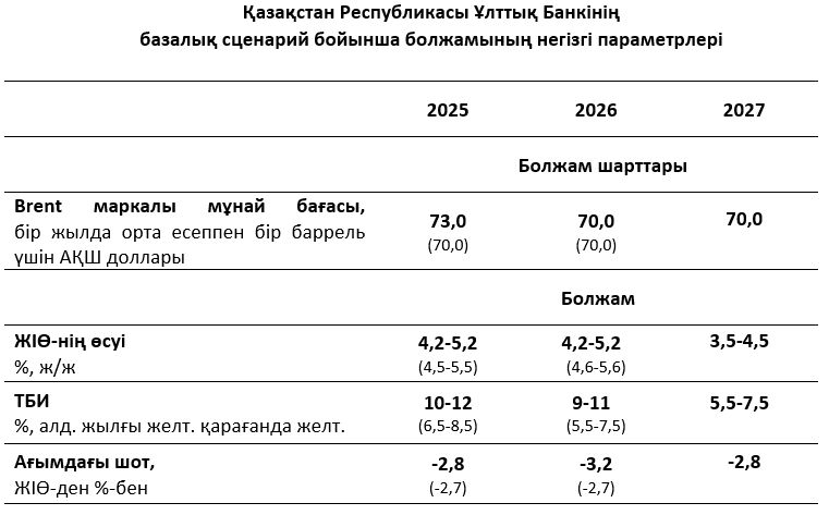 Қазақстан экономикасының өсуі бойынша 2025 және 2026 жылдарға жасалған болжам 4,2-5,2% деңгейіне дейін біршама төмендеді. Осындай қайта қарауға бірқатар факторлар, соның ішінде мұнай өндірісіне қатысты Үкімет болжамының төмендеуі себеп болды. Ал мұнай секторының қалпына келуі жағдайындағы ішкі сұраныстың оң динамикасы 2025-2026 жылдары экономиканың өсуін қолдайды. 2027 жылы салық-бюджет саясатының шоғырландыруына байланысты ЖІӨ-нің өсуі әлеуетті мәндерге жуық – 4,5%-ға дейінгі ауқымда қалыптасады. Сонымен бірге Үкімет жоспарлаған құрылымдық реформаларды, оның ішінде негізгі капиталға инвестицияларды ұлғайту, тікелей шетелдік инвестициялар тарту және экономиканы ырықтандыру бойынша реформаларды сәтті іске асыруды ескере отырып, нақты өсу біршама жоғары болуы мүмкін.