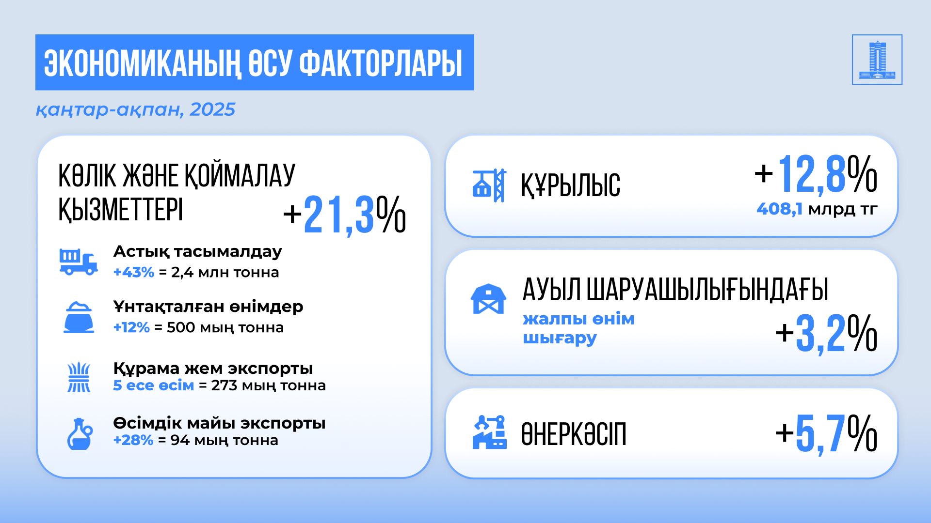 Құрылыс саласында жоғары қарқын сақталған. Орындалған жұмыстар көлемі 408,1 млрд теңгеге, ал нақты көлем индексі 112,8%-ға жетті. Сауда саласындағы өсім 6%-ға, ал көлік және қоймалау қызметі 21,3%-ға артқан.