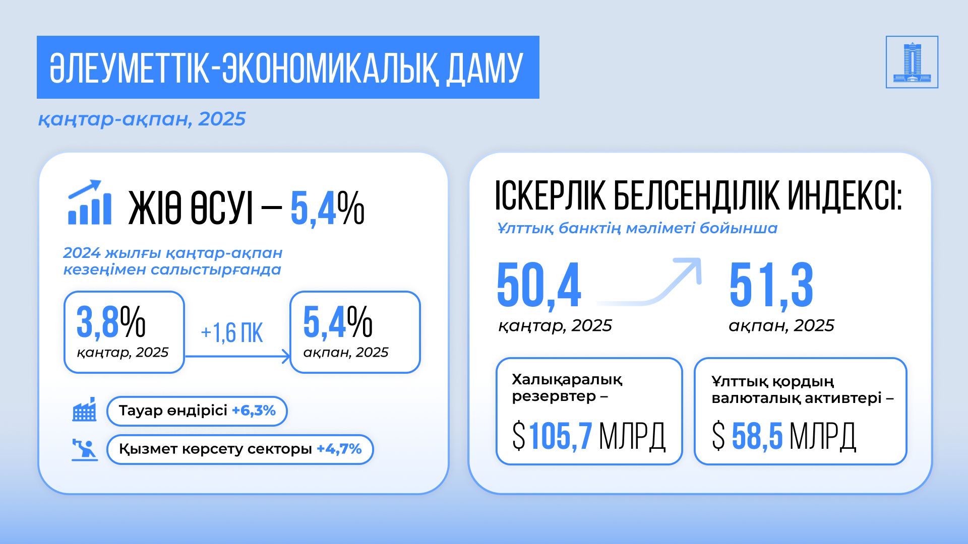 "Есепті кезеңде ЖІӨ өсімі 5,4%-ды құрады. Тауар өндірісі мен қызмет көрсету секторында өсу серпінінің жақсарғаны байқалады. Өнеркәсіптік әлеуетті ашу бойынша жүргізіліп жатқан жұмыстар өнеркәсіп өндірісінің көлемін 5,7%-ға арттыруға мүмкіндік берді", - делінген хабарламада.