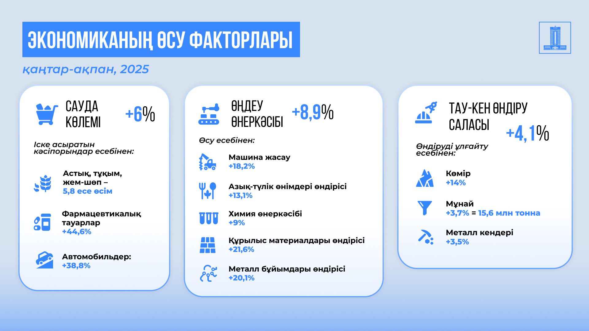 Өңдеу өнеркәсібі бойынша бұл көрсеткіш 8,9%-ды құрады. Негізгі салалар ішінде машина жасау (18,2%), азық-түлік өндірісі (13,1%), құрылыс материалдары өндірісі (21,6%) және металл бұйымдары өндірісі (20,1%), сондай-ақ химия өнеркәсібі (9%) жоғары көрсеткіштер көрсетті. Тау-кен өнеркәсібінде өсім 4,1%-ды құрады.