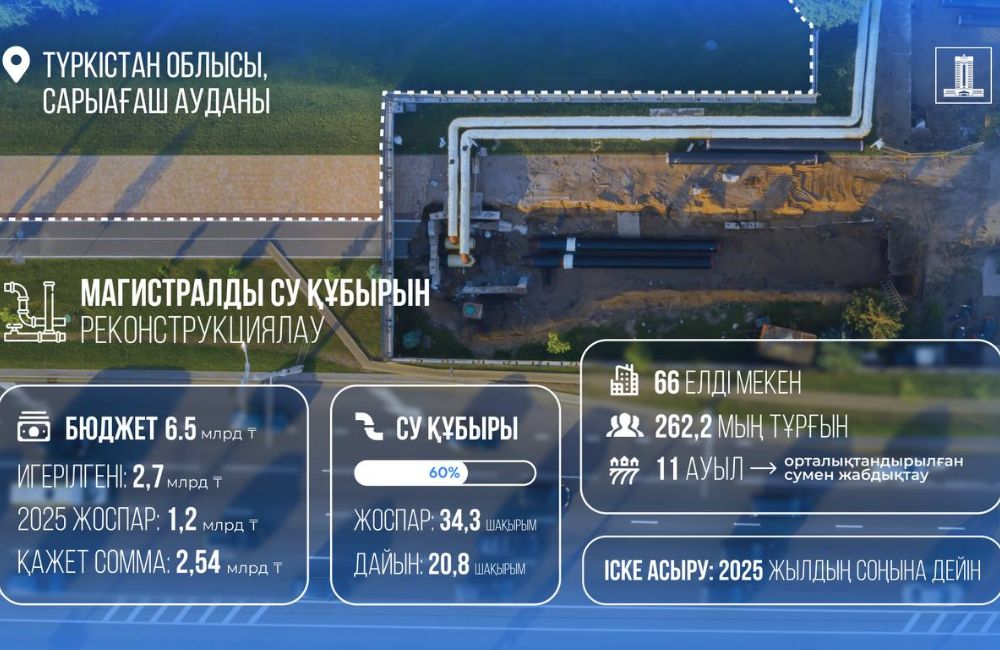 Түркістан облысы Сарыағаш ауданындағы магистралды су құбырын реконструкциялау жұмыстарын аяқтау үшін Арнаулы мемлекеттік қордан 2,5 млрд теңгеден астам қаржы бөлінді. Жоба 260 мыңнан астам тұрғыны бар 66 ауылды сумен қамтамасыз етуге бағытталған.