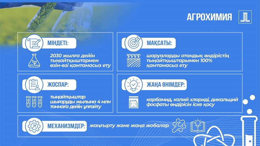 «Қайта жаңғырту және жаңа жобалар есебінен 2030 жылға дейін жалпы тыңайтқыштар көлемі 4 млн тоннаға дейін ұлғайтылады», — деді министр.
